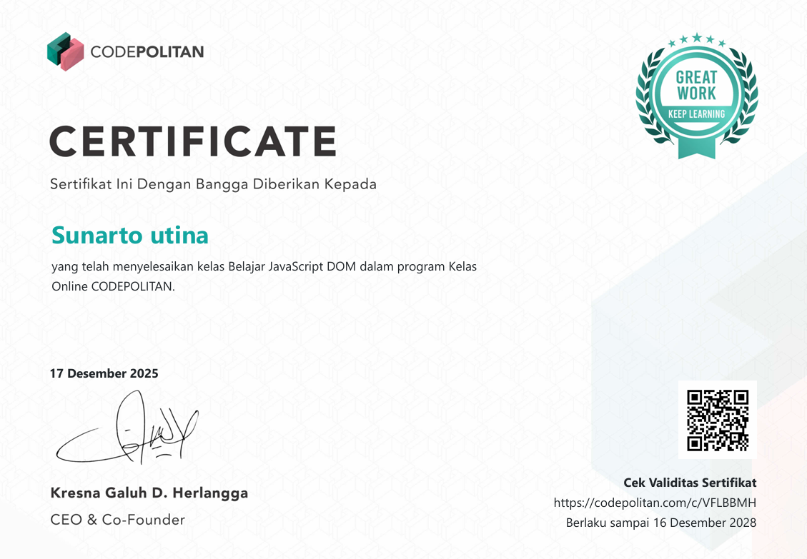 Belajar Dasar Pemrograman JavaScript (Dicoding) adalah sebuah kelas pembelajaran online bertingkat dasar yang dirancang untuk membantu pemula memahami konsep fundamental bahasa pemrograman JavaScript — bahasa pemrograman yang menjadi bagian penting dalam pengembangan aplikasi web modern, baik di sisi front-end maupun back-end. Kelas ini disusun secara struktural dengan materi yang relevan untuk membangun dasar logika pemrograman dan keterampilan praktis dalam menulis kode JavaScript sesuai standar industri.