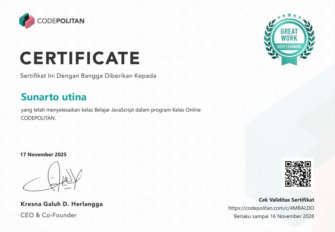 Kelas ini ditujukan bagi siapa saja yang baru mengenal dunia pemrograman atau ingin memperkuat fondasi JavaScript sebelum melanjutkan ke jalur pengembangan web, baik sebagai front-end developer, back-end developer, atau full-stack developer.